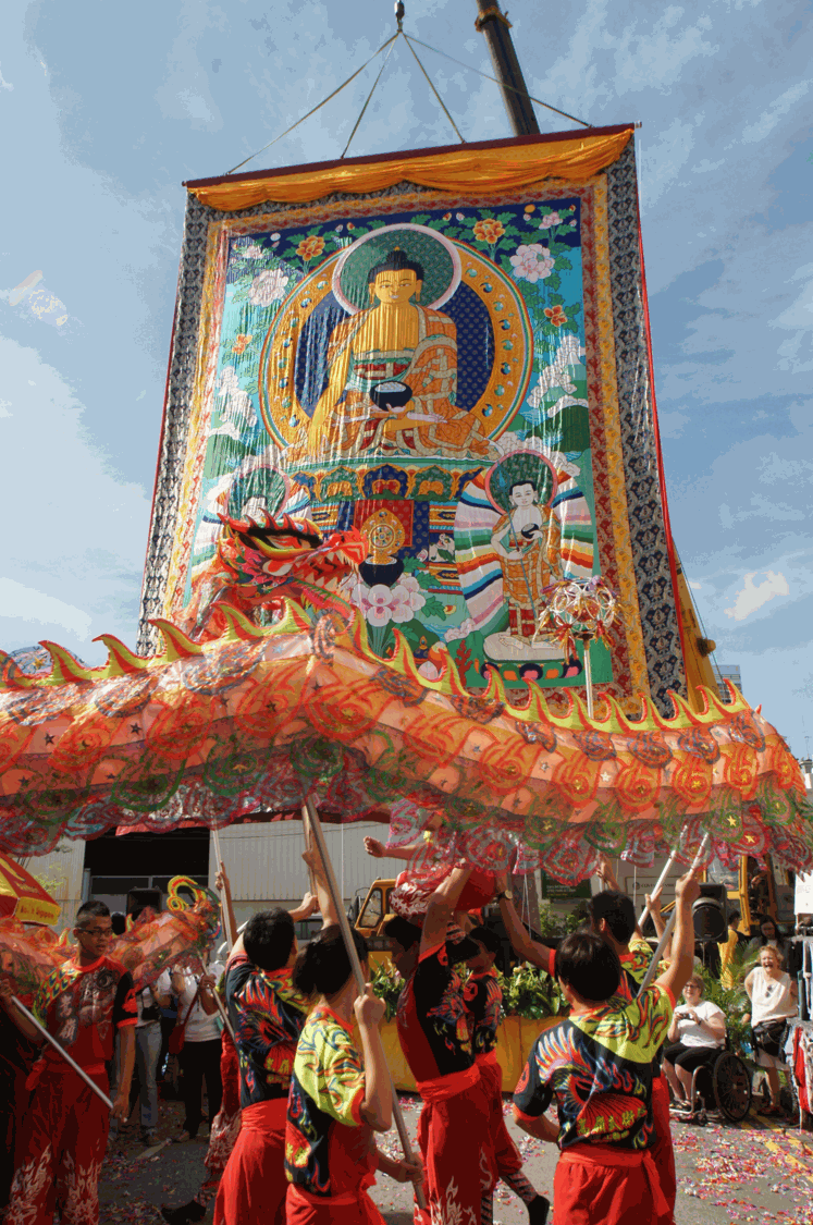 In 2010, Thekchen Choling commissioned an appliqué thangka of Guru Rinpoche (also known as Padmasambhava, “the Lotus Born”) from Nepal, for the long life of the Gurus. The thangka depicts Guru Rinpoche accompanied by Shakyamuni Buddha, Lama Je Tsongkhapa and his two key spiritual consorts Princess Mandarava and Lady Yeshe Tsogyal. Standing at a height of seven storeys, it is the largest Guru Rinpoche thankga in Southeast Asia; more than 20 men are required to carry it.